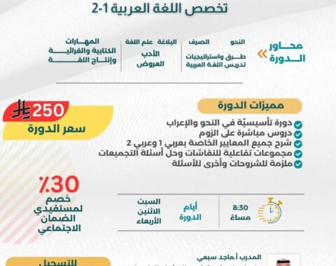 -محاور الدورة • النحو • الصرف • البلاغة • علم اللغة • العروض • الأدب • طرق واستراتيجيات • تدريس اللغة العربي • المهارات الكتابية و القرائ...