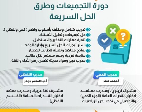 دورة التجميعات وطرق الحل السريعة – القدرات العامة (كمي ولفظي)تدريب مكثّف وشامل بأسلوب سهل وواضح، يشمل:✅ حل التجميعات وتنمية مهارات التفكير....