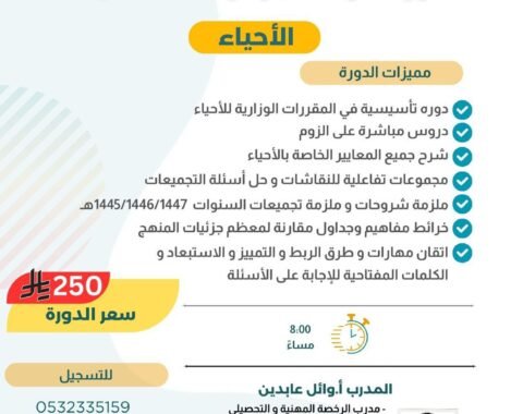 -مميزات الدورة دورة تأسيسية فى المقررات الوزارية للأحياء دروس مباشرة على الزوم شرح جميع المعايير الخاصة بالأحياء مجموعات تفاعلية لحل أسئلة التجميعا...