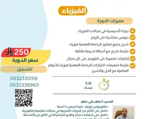 مميزات الدورة -دورة تأسيسية في مجالات الفيزياء -دروس مباشرة على الزوم -شرح جميع معايير الرخصة المهنية فيزياء -ملزمة شرح مع أسئلة تدريبية مكثفة -إخت...